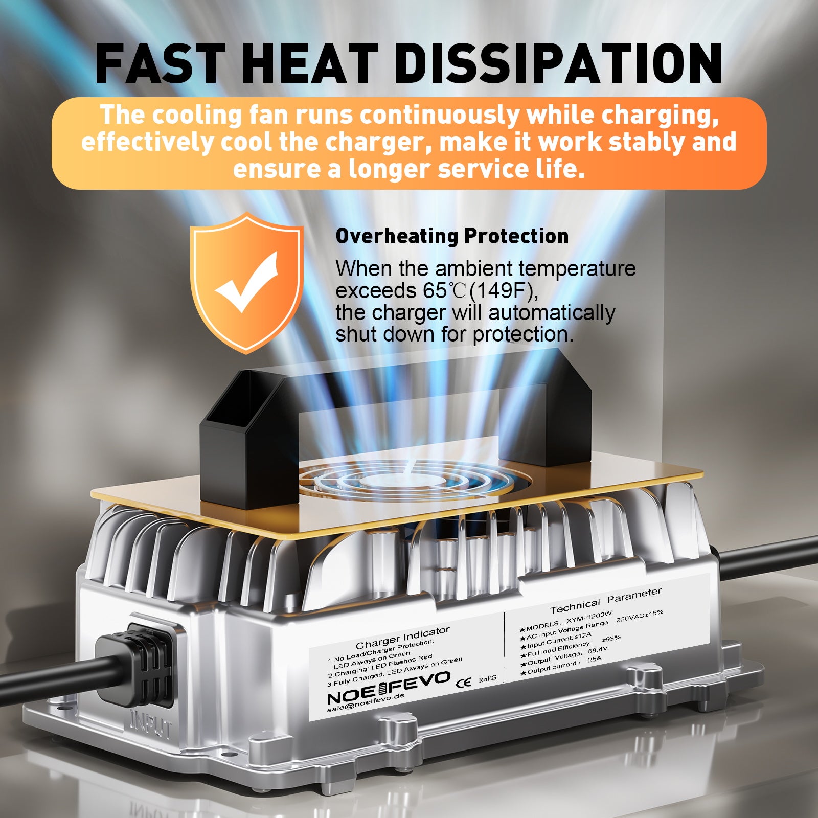 NOEIFEVO 58,4V 25A LiFePO4-Akkuladegerät für 48V (51,2V) 16S-Akkus, IP67 wasserdicht, 0V BMS-Aktivierung, automatische Abschaltung, umfassender Schutz, für Golfwagen und Wohnmobile.